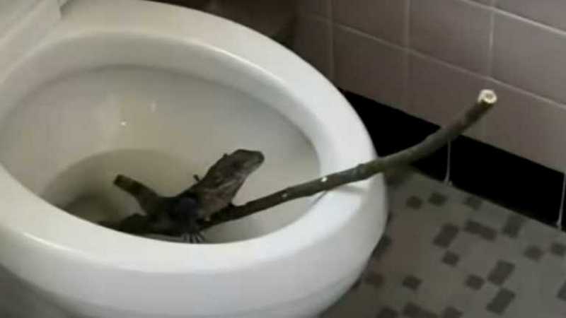 Мужчина растерялся и решил поймать игуану. Он хватал ее за хвост, однако не мог достать из унитаза.
